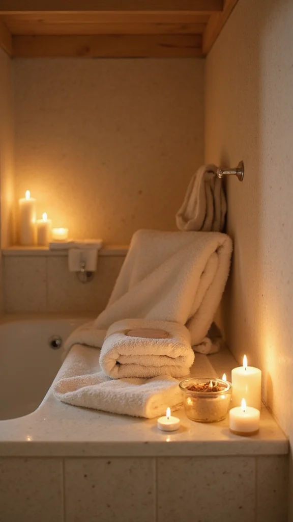 Turn your bathroom into a calm retreat with spa touches. Scented candles, plush towels, and natural bath products set the mood. A wooden tray can hold candles or a book for a mini escape. Soft textures and scents slow your pace in a good way.