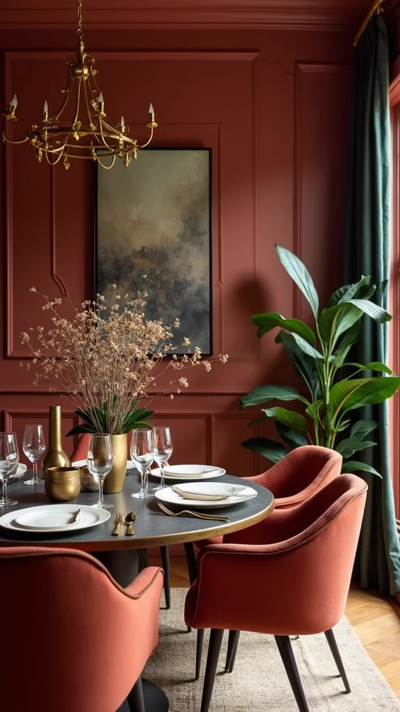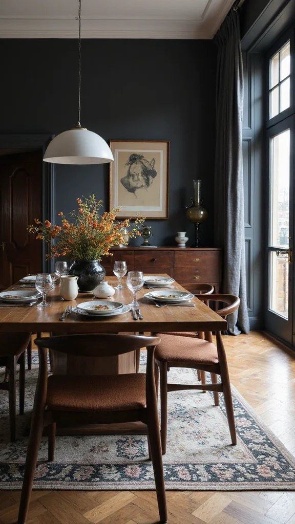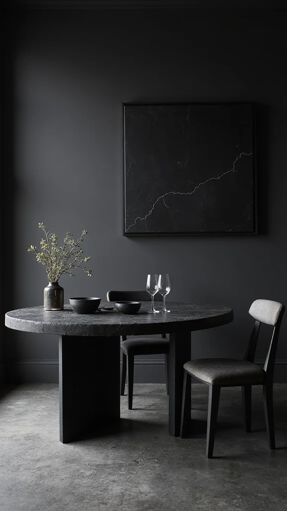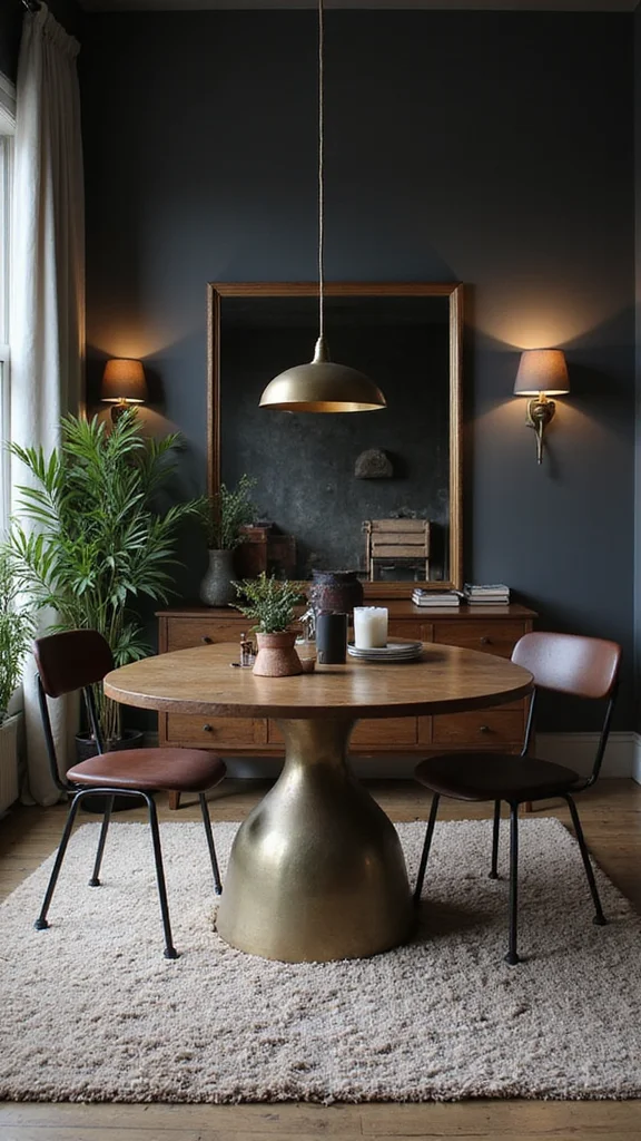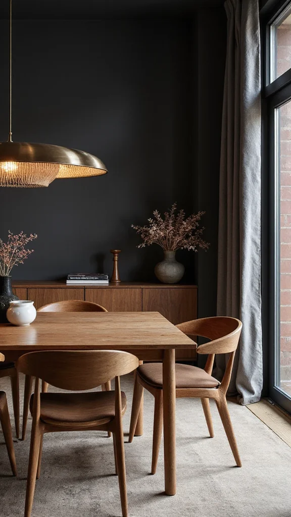 To bring it home, balance the darkness with a lighter dining table and soft textures. Opt for a statement chandelier or brass mirrors to reflect light. Layer textures like velvet cushions or a wool rug for depth. This approach keeps the space contemporary yet warm, perfect for intimate meals.
