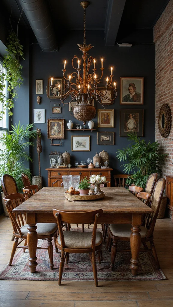 An eclectic mix lets you blend styles and tell your story. Dark, modern dining rooms welcome unique finds, antiques, or quirky decor. This style is all about personal expression, mixing textures, colors, and forms. Choose a few standout pieces that contrast yet fit the vibe. Personal touches like travel mementos elevate character. This approach makes the room feel one of a kind.