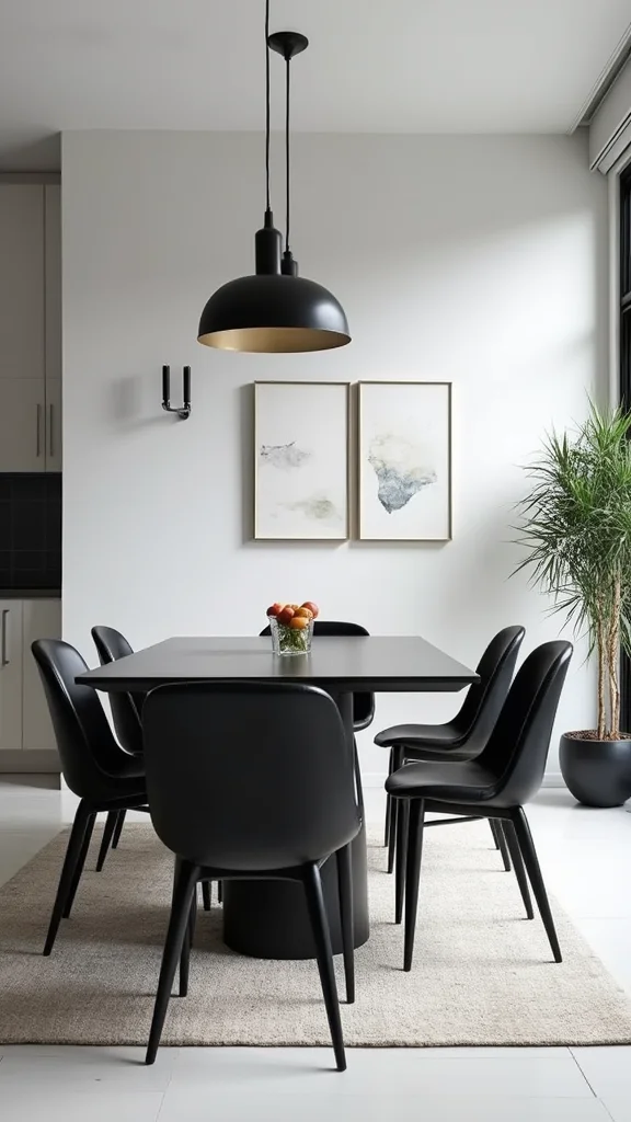 The black and white duo stays fresh and bold. Black walls with white furniture create a striking contrast. This look is modern and timeless at once. You can swap a black dining table with white chairs or vice versa. Keep decor minimal to maintain the chic vibe and add a bold piece of art or a striking centerpiece for focus. Geometric patterns in textiles or art can boost the modern feel without overwhelming the room.