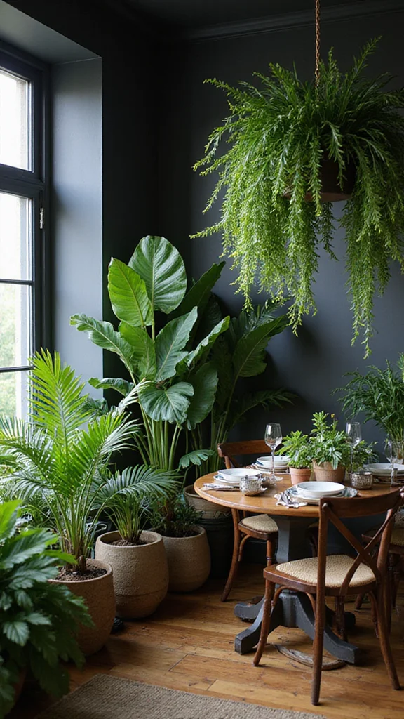 Plants bring life to dark dining rooms. Large floor plants and small table arrangements add freshness. Snake plants and monstera thrive in low light and help purify air. Arrange plants at different heights and in stylish pots to fit your decor. Hanging planters save space and add elegance. A variety of greens creates a small indoor jungle, boosting vibrancy and warmth.