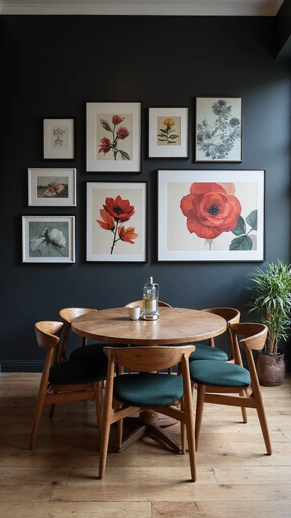 Art transforms a dining room and shows your personality. Large works on dark walls create striking contrast. A gallery wall with varied frames adds depth. A centerpiece above the table can spark conversation. Colorful art brightens the space, while monochrome pieces offer unity. Place artworks at eye level for maximum impact. Mixing frames and styles keeps the display lively and interesting.