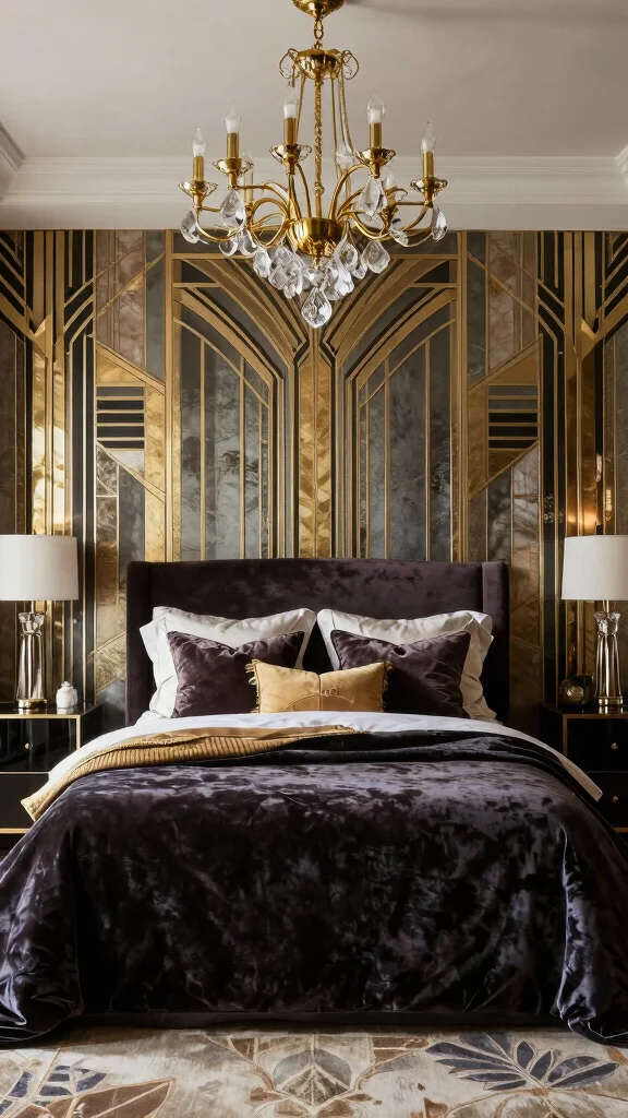 Art Deco inspires with bold glamour and clean lines. A velvet bedspread in deep tones sets the mood, while gold accents on mirrors and lamps add shine. Vintage or antique pieces keep the room grounded in history. Geometric pillows and rugs echo the era, but the vibe stays balanced with simple, modern furniture. A statement chandelier can crown the space without overwhelming it. The blend of old and new creates a stylish, timeless feel that still respects the planet.
