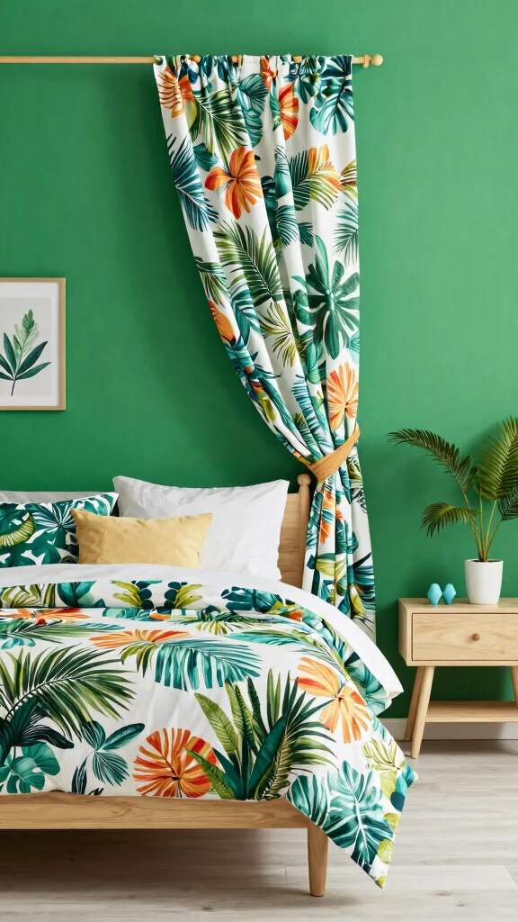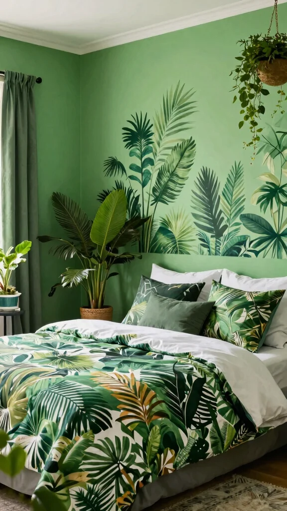 Transform the bedroom into a tropical oasis with vibrant greens. Bold greens on walls or large tropical prints on bedding create an energetic vibe. Pair with light wood or white furniture to keep the look fresh, and add palm leaves or banana motifs for a vacation feel. This approach is youthful and lively.