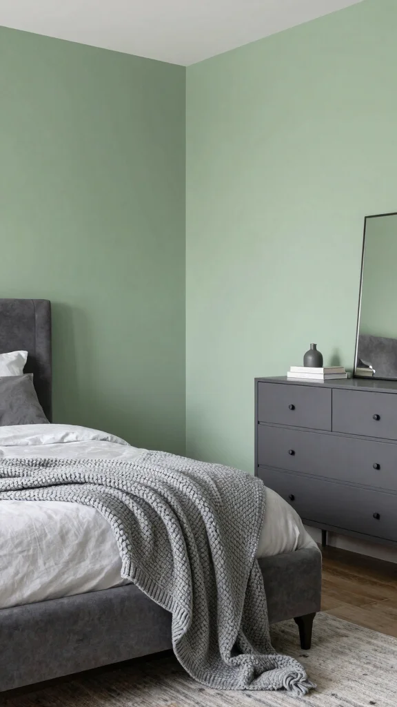 Pairing green with gray creates a sleek, balanced look. Soft green walls can sit with rich gray furniture or decor for warmth and coolness at the same time. A chunky gray knit throw adds texture, while natural light keeps the space inviting. This palette works as a calm retreat with a modern edge.