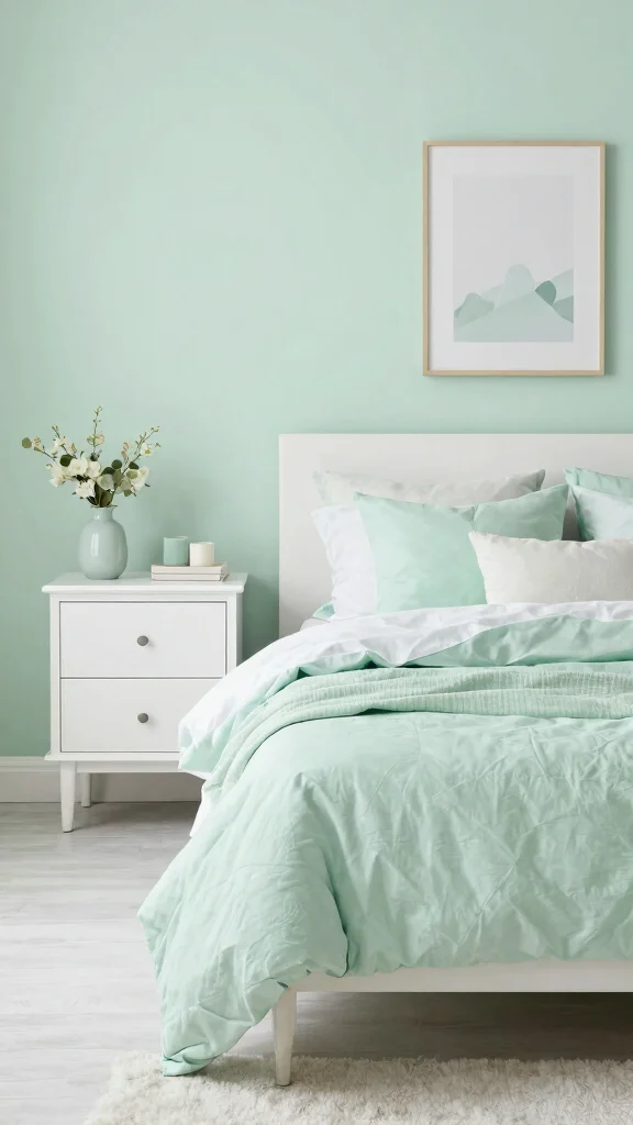 Pastel greens offer soft, calm vibes. Paint walls pale pastel green and pair with white furniture for a serene backdrop. Layer textiles in gentle patterns and add delicate accessories like pastel art or soft decor items. The result is a restful retreat for rest and renewal.