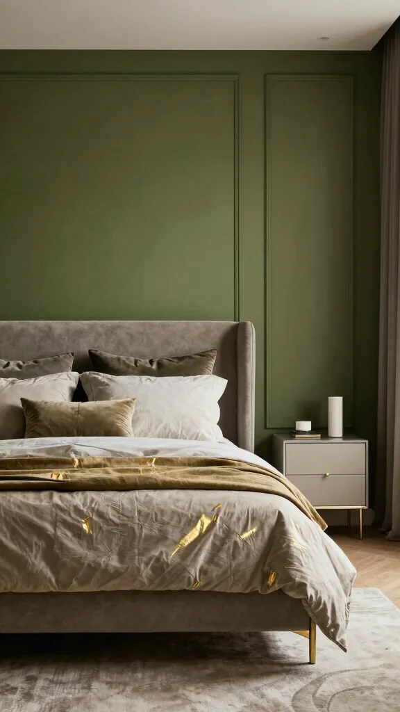 Olive adds earthiness with a modern edge. Feature walls in olive pair nicely with neutral, sleek furniture. Pinterest trends show olive with black or copper accents, creating striking contrasts. The look feels sophisticated and grounded, a quiet luxury in a bedroom.