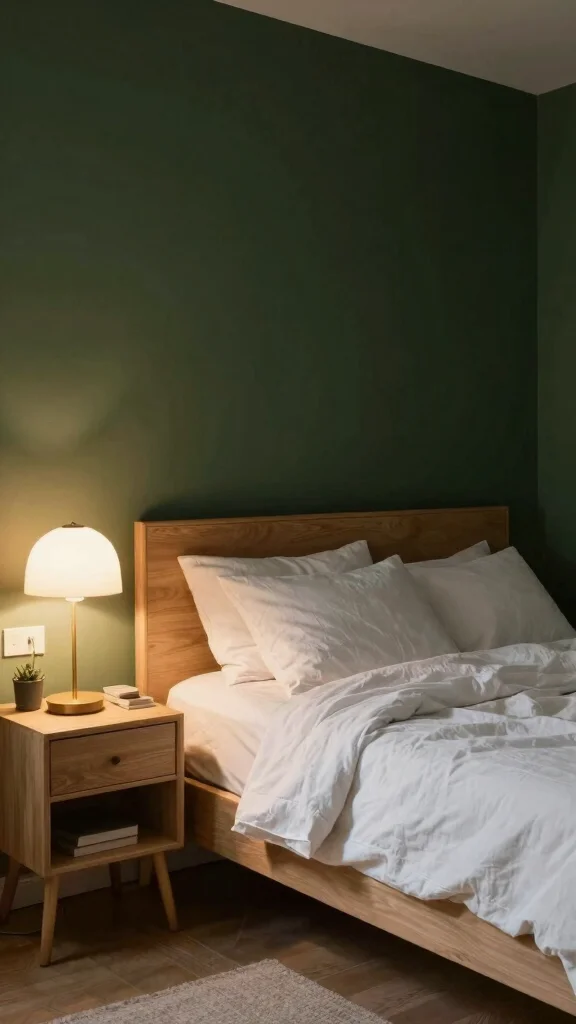 Dark forest green creates intimacy and depth. It makes the bedroom feel like a cozy retreat. Pair the walls with light-colored furniture and textiles to keep the space from feeling heavy. Soft white linens and light wood accents brighten the room. Warm lighting enhances the intimate vibe, making the space inviting at night.