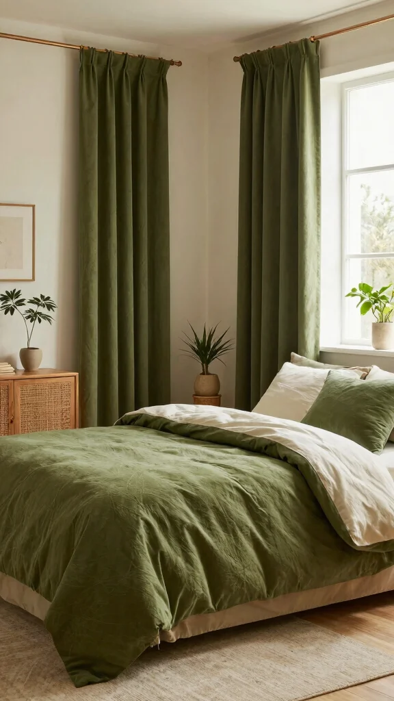 Moss green brings a grounded, earthy mood to the bedroom. Use moss as an accent on bedding or curtains and pair it with creamy whites or soft browns for balance. Add wooden furniture and plants that handle lower light to enhance the moss theme. This creates a tranquil space ideal for relaxation.