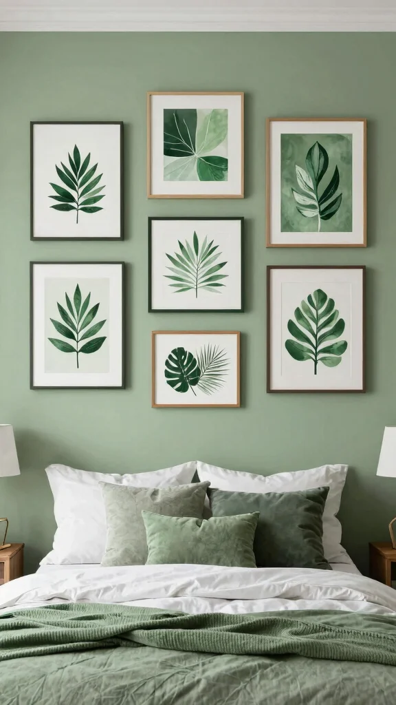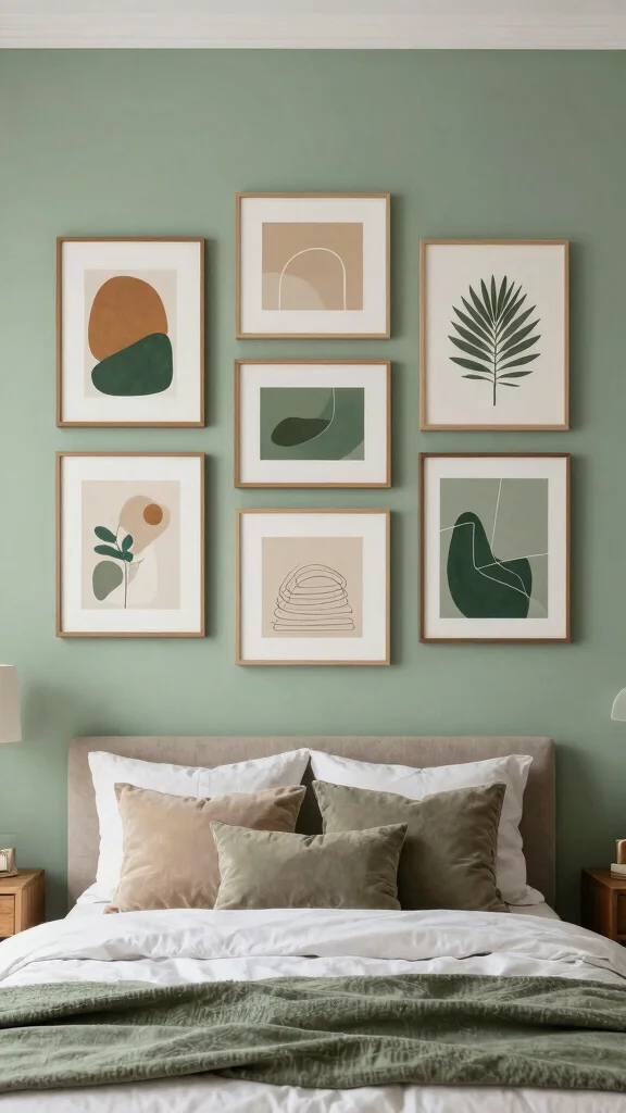 Artwork that nods to green ties the room together. Look for pieces with greens plus browns, whites, or golds. Botanical prints or abstract pieces work well.