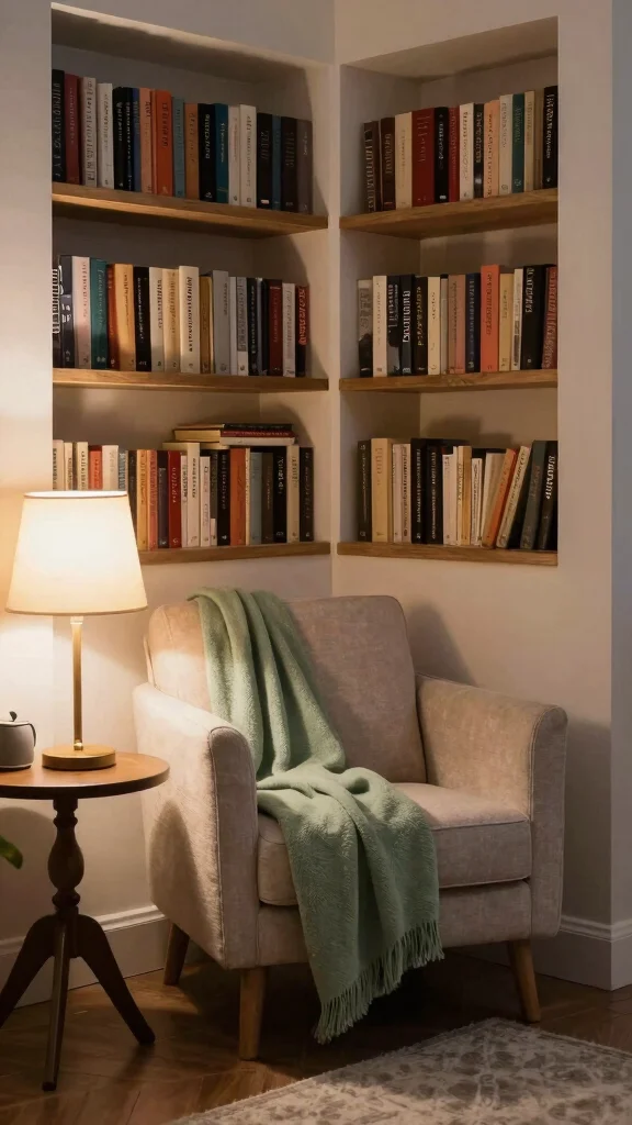 Turn a corner into a warm reading spot. A comfy chair, a soft sage throw, and cushions invite curling up. Add a small table and a lamp for easy reaching light.