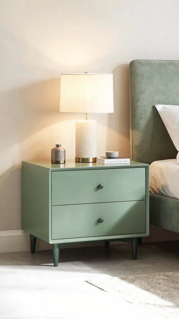 Nightstands and lamps set the room tone. Pick pieces that echo the room style, with a hint of sage on the finish or texture. A warm lamp becomes a focal point as well as a light source. Keep accessories minimal for calm surfaces.