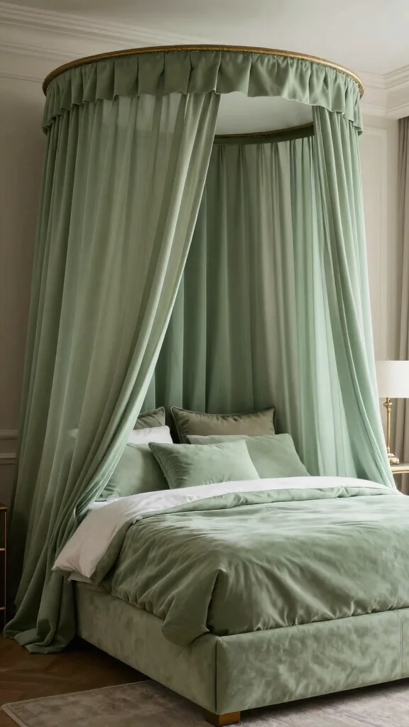 A sage green canopy bed creates a dreamy focal point. A full fabric canopy or sheer curtains around the bed adds romance and comfort. Pair with plush textiles to boost softness.