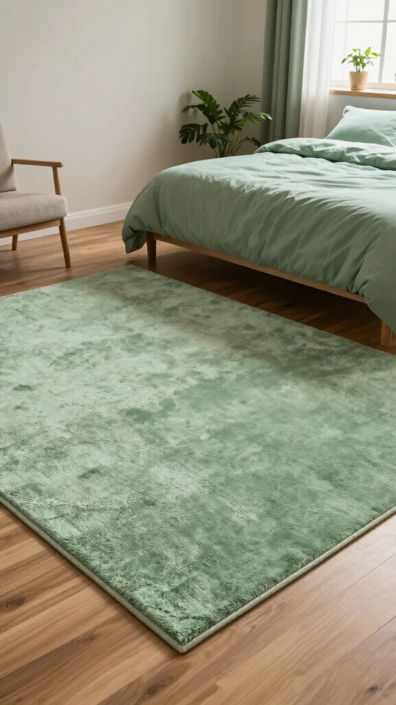 A statement rug anchors a sage green bedroom beautifully. Look for rugs that weave sage with other gentle colors to tie the room together. Warm textures invite walking barefoot and define spaces in larger rooms.