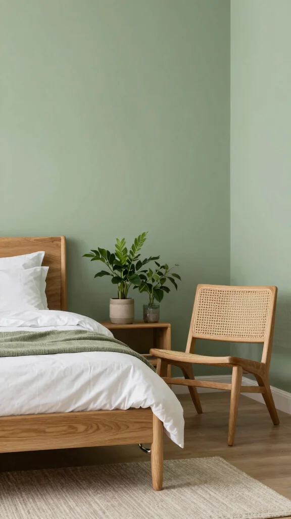 Natural elements bring a calm, grounded feel to a sage green room. Wooden furniture, rattan accents, and stone details connect the space to nature. Plants add life and improve air without cluttering the look.
