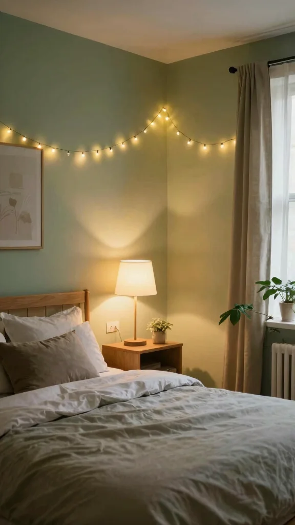 Lighting shapes the mood in a sage green bedroom. Warm, soft light creates a relaxing retreat. Include bedside lamps, strings of lights, and dimmable fixtures to adjust the glow.