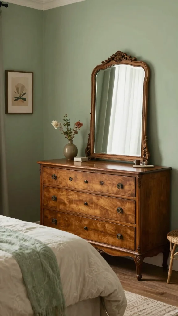 Vintage accents add warmth and character to a sage green bedroom. An antique dresser or a vintage mirror creates contrast with soft greens. Reclaimed wood and distressed finishes amplify the nostalgic vibe.
