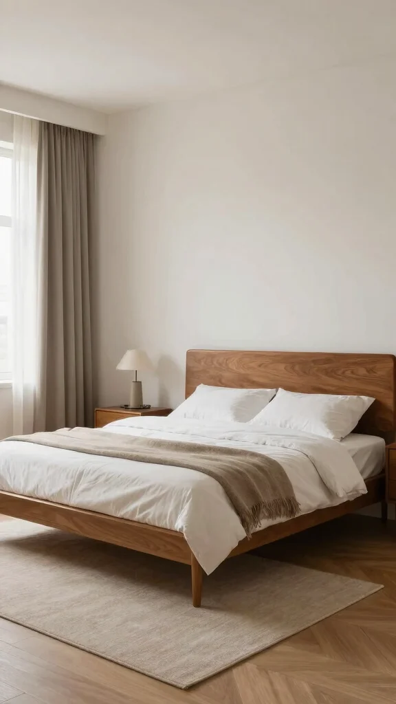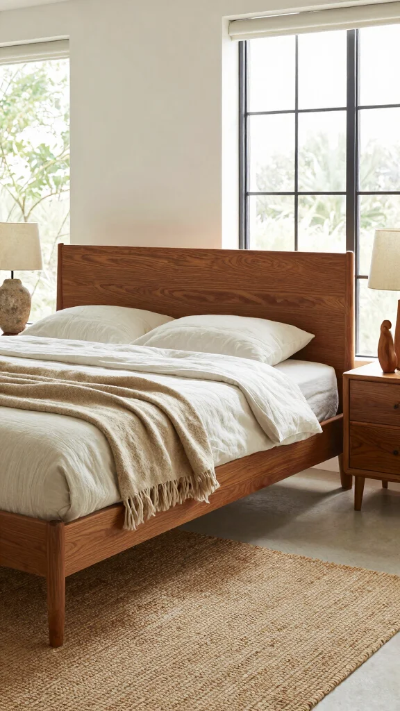 Start with a sturdy wood bed and matching nightstands in warm finishes. Look for budget-friendly options like unfinished pieces you can stain yourself. Layer textures with a wool throw or cotton bedding to keep the natural vibe. This approach creates a calm, inviting space you want to linger in at night.
