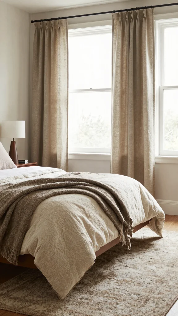 – Mix textures across bedding and curtains for depth
