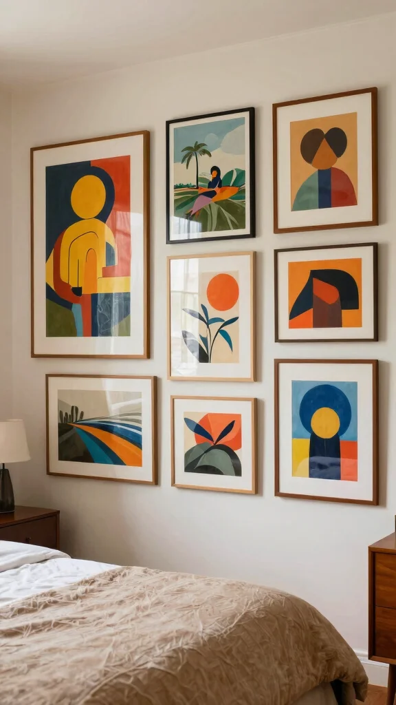 Art helps your space tell your story. Choose pieces that speak to you and fit the mid-century vibe. Abstract works or classic prints work well with clean lines. Display a gallery on one wall or a few larger works for impact. The goal is a homey, designed feel, not a showroom.