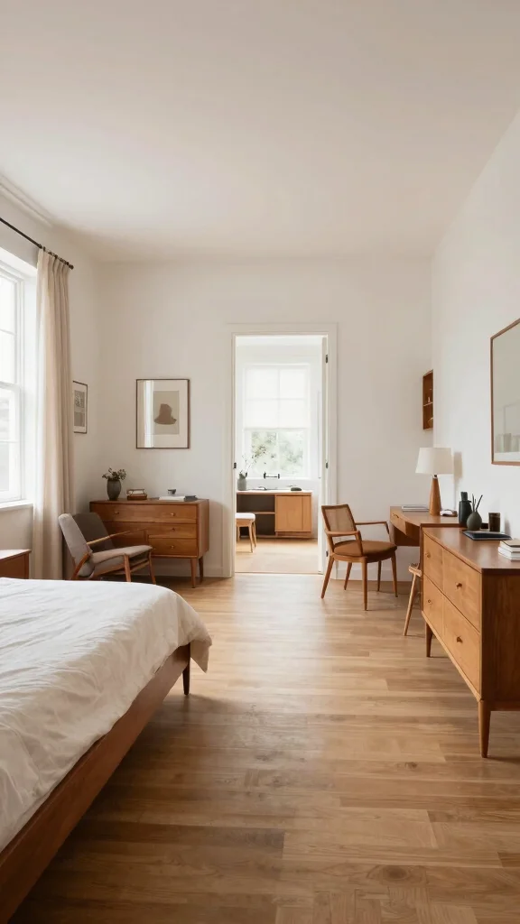Choose pieces that serve two roles, like a bed with storage. Opt for tapered legs to echo the era. Keep pathways clear to enhance airiness and ease of movement. It makes the room feel organized and easy to live in.