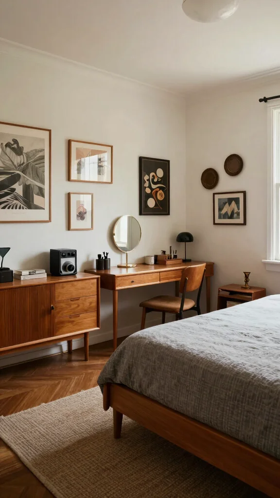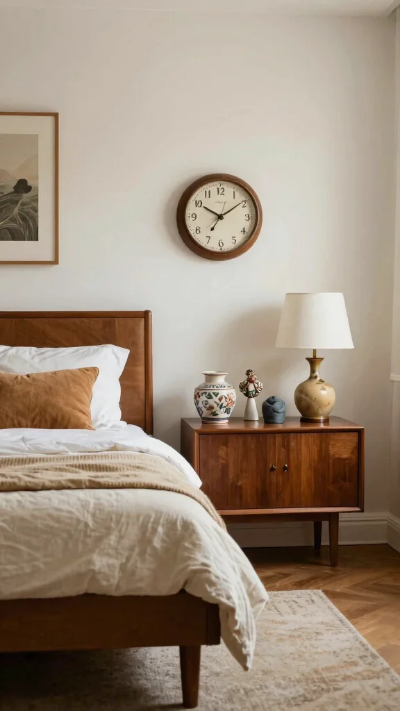 Vintage accents finish the room with texture and history. Small pieces bring personality without crowding the space. Think retro clocks, ceramic bowls, and sculptural pieces that nod to the era. Place them on shelves or nightstands to tell a story. These touches make the room feel thoughtfully curated.