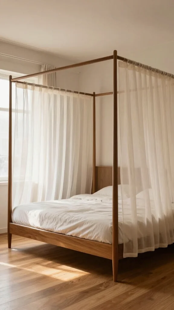 A canopy bed adds elegance and cocooning warmth. Canopy beds give a refined silhouette and a sense of enclosure. For mid-century style, pick a simple frame in wood or metal. Drape light fabrics like sheers to soften the look or heavier textiles for privacy. This design blends timeless charm with modern restraint.