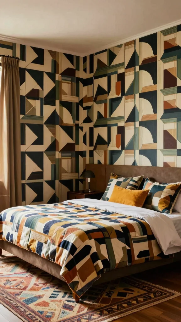 Geometric patterns inject energy and a clean rhythm into a bedroom. Bold shapes on wallpaper or bedding create a confident focal point. Pair them with solid furniture to keep balance. Designers show these patterns in design feeds, proving they stay fresh and chic.