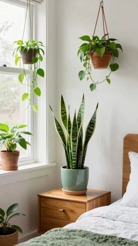 Pick low-light options like snake plants and pothos. Use hanging planters to save floor space. Place plants near windows or on slim shelves to keep sightlines open. This greenery cleans air and adds a gentle vitality.
