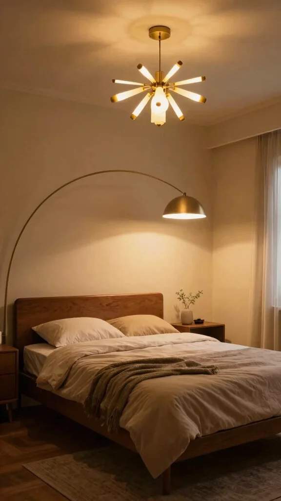 Lighting becomes art in a mid-century bedroom. A standout lamp can sculpt the mood and draw the eye. Seek iconic shapes like arc floor lamps or starburst pendants. Place lighting to create warm pools around the bed and seating area. Lighting sets tone and depth, making the room inviting rather than flat.