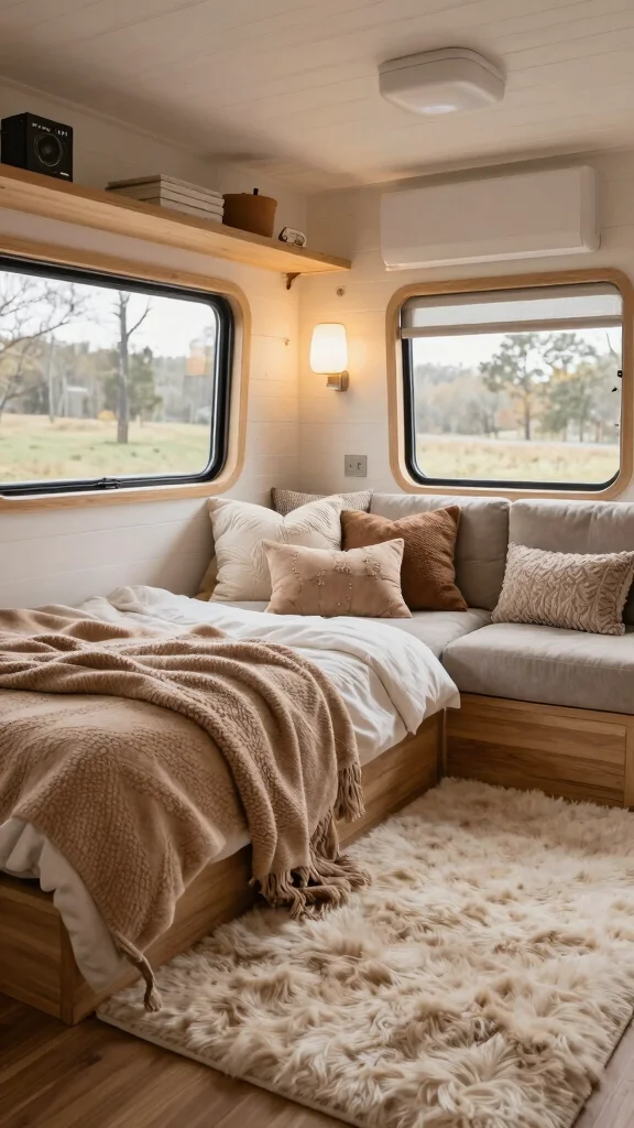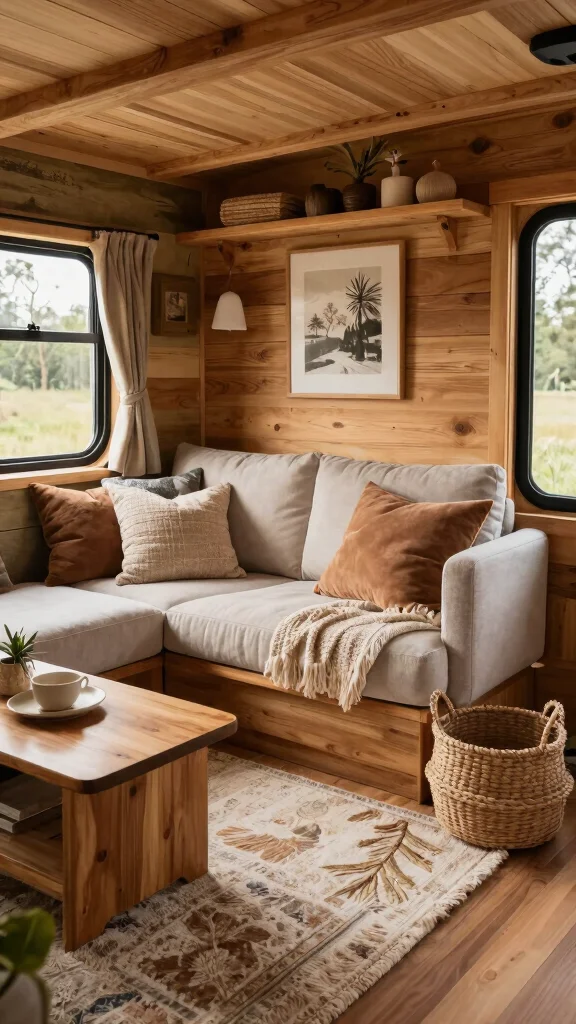 In a modern tiny house living room, multi-functional furniture is your secret to space and style. A coffee table that hides blankets, plus a sofa bed for guests, proves practicality can be beautiful.