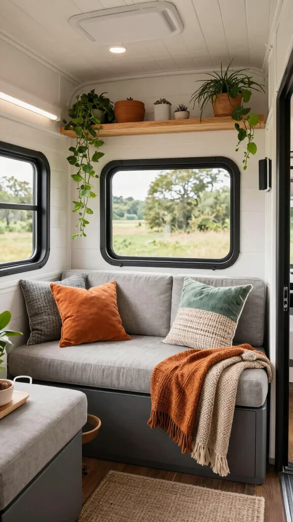 Designing a modern tiny house living room that feels spacious starts with a few intentional choices. Use a light, cohesive color palette and choose slim, multi-functional furniture (like a sofa bed or storage ottoman) to maximize every inch. Opt for hidden or wall-mounted storage to cut visual clutter. Add a large mirror or reflective surfaces to bounce light and create depth. Finally, layer greenery strategically—place compact pots on a slim console or use wall-mounted planters to bring vitality without crowding the floor. These steps help with stress relief and make a small space feel big.
