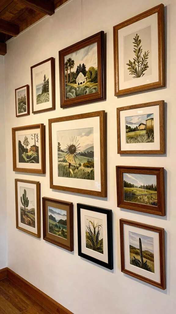Art should echo the outdoors. Choose nature scenes or botanical prints in muted tones. Wood frames tie art to rustic roots. Create a gallery with varied sizes for energy.
