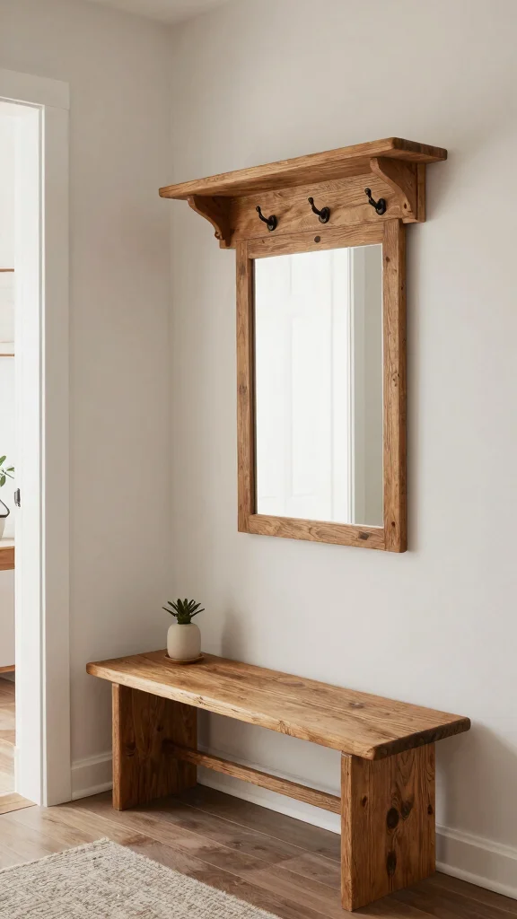Entryways set the mood for the home. Include seating, hooks, and baskets for quick storage. Natural wood finishes tie to the theme and keep the space welcoming. A mirror adds space and function.