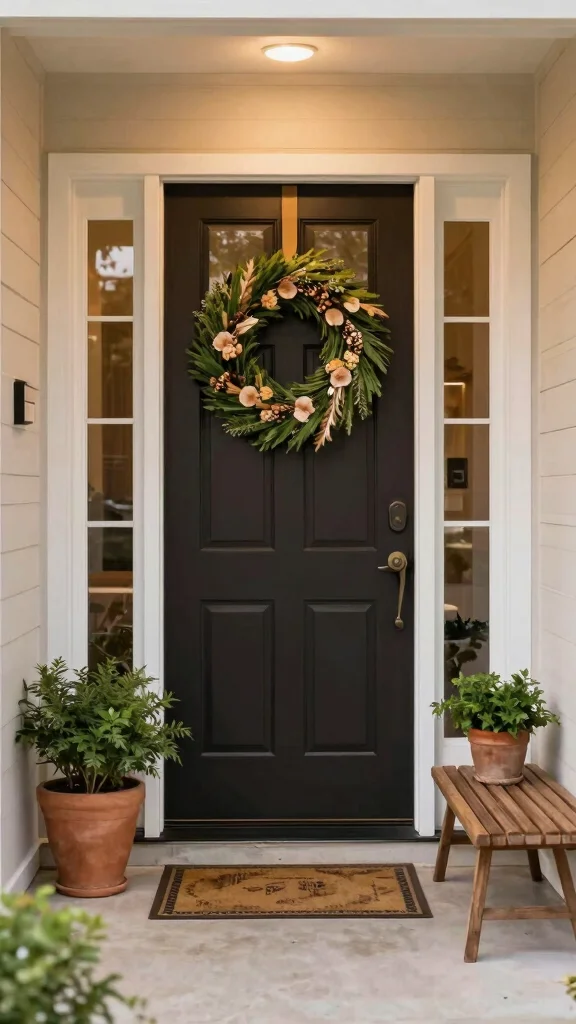 Your entry shows hospitality from the first step. Hang a wreath or use natural fiber mats. Place planters on both sides for balance. A small bench invites a pause.
