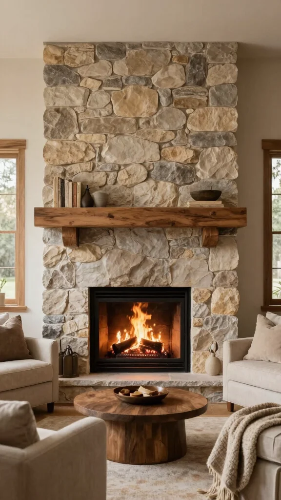 Pair it with warm lighting and soft fabrics. A simple coffee table and a nearby shelf hold wood and decor. Logs on the mantel and a few candles add glow.
