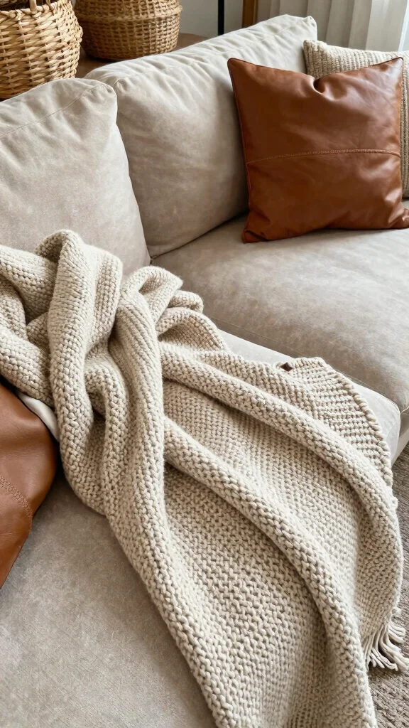 Introduce baskets for storage and warmth. Layer cushions, drapes, and rugs with different textures. Add a chunky knit throw as a focal texture. Keep patterns simple to let textures shine.