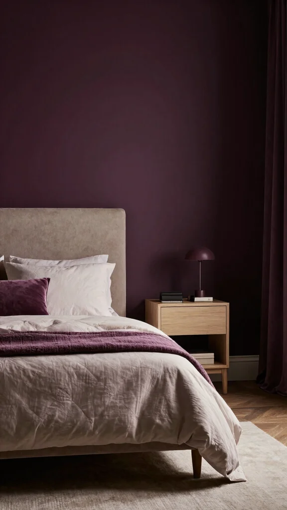 Moody plum adds depth and a sense of luxury. It works well in bedrooms or lounges where you want a cocoon-like feel. When paired with light furniture or metallic accents, plum keeps balance and avoids heavy gloom. Use it on an accent wall to deliver a bold touch. Layer in soft neutrals and warm textures to ground the look. Art with contrasting colors can sharpen the overall scheme.