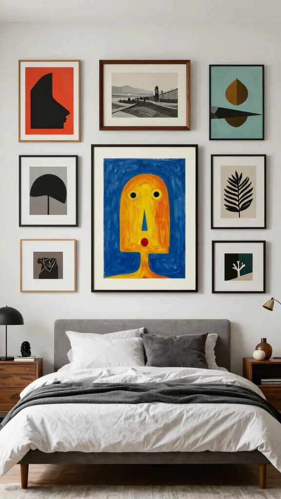 Art brings character and a sense of calm to a bedroom. You can opt for a dramatic statement piece or a curated gallery wall of smaller works. The right artwork sets the tone and can spark a serene mood. Designers often mix frames and styles for an eclectic yet cohesive look.