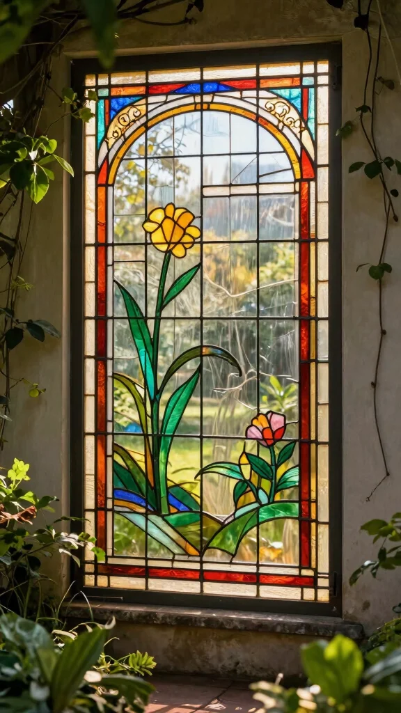Place stained glass near light sources for color play. Choose outdoor-safe glass and frames. Mix sizes for a dynamic display. Use metal frames that weather well.