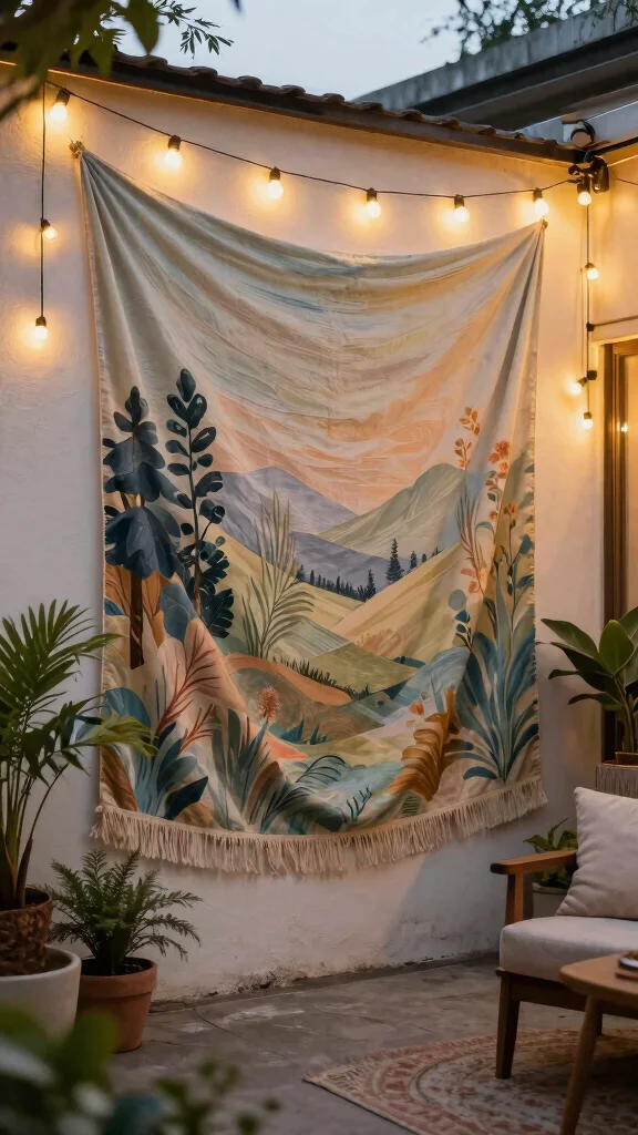 Textile wall hangings soften hard exterior walls with warmth and color. Choose fabrics designed for outdoors, like solution-dyed acrylics, and skip delicate weaves. Opt for calming tones such as blues, greens, or sandy beige. Place under a covered area to protect from rain while keeping a breezy vibe.