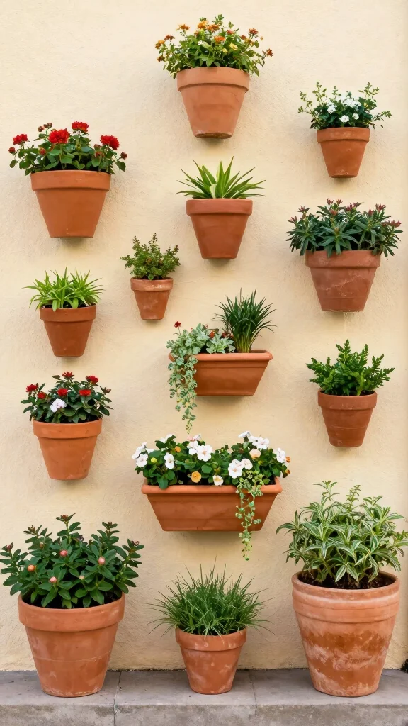 Terracotta planters brighten walls with earthy warmth and color. Arrange pots in a tiered or scatter layout for playful rhythm. Paint pots in soft pastels or add hand-painted motifs for extra charm. Mix sizes and shapes to avoid monotony.