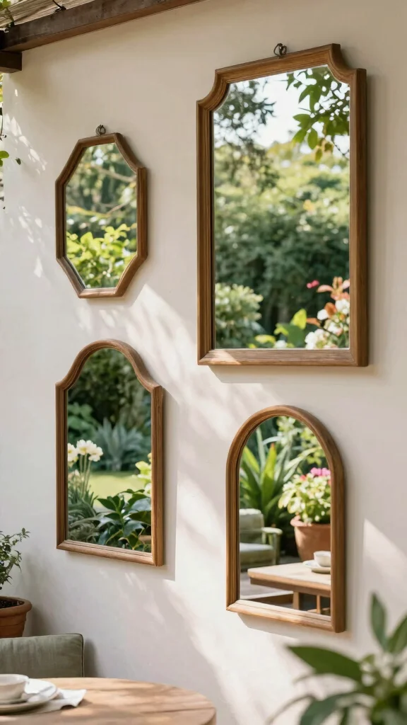 Outdoor mirrors create space and light. They bounce light and make small yards feel bigger. Use weatherproof frames to stand up to rain and sun. Place a mirror where it reflects a view or a seating area to double the effect. Mix shapes to keep the wall lively.