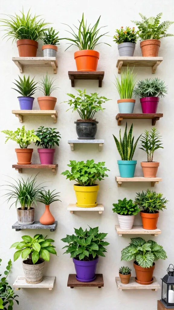 Fun fact: A wall of tiny landscapes from plant shelves can boost your space’s calm factor by up to 30%. Use weather-resistant shelves and place them at varying heights to create a staircase of greenery—it’s outdoor wall art that actually feels alive.