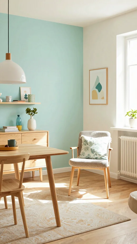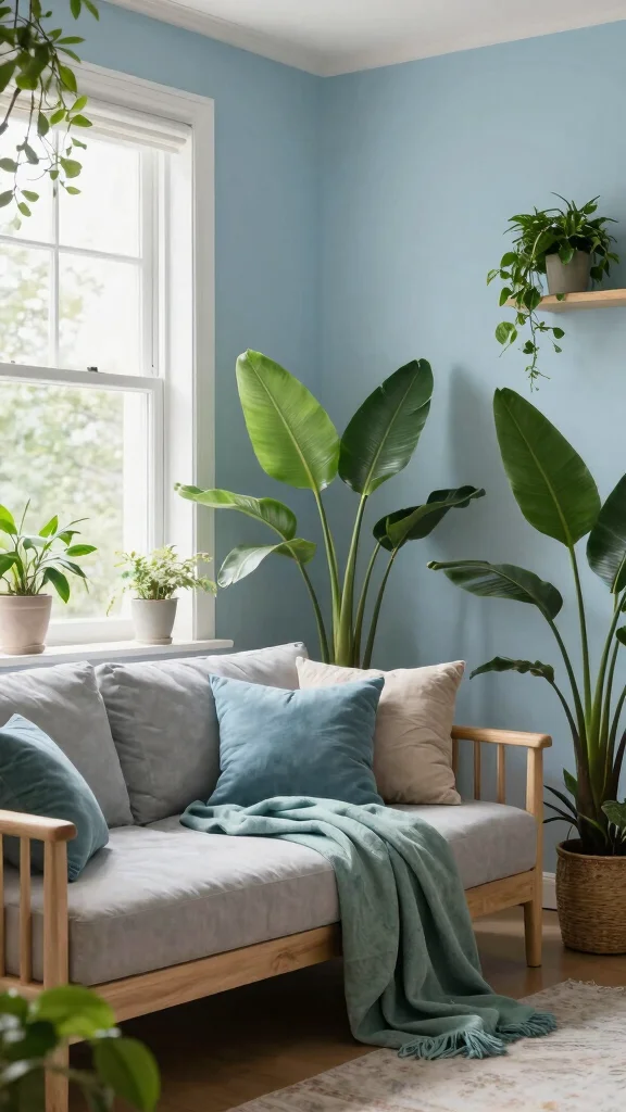 Serene blues and greens set a calm, nature-inspired tone. These hues soften spaces and invite rest. Picture walls in a gentle sky blue with mint green accents, plus natural wood furniture for balance. Subtle linen and plush textiles add coziness while keeping the mood light.