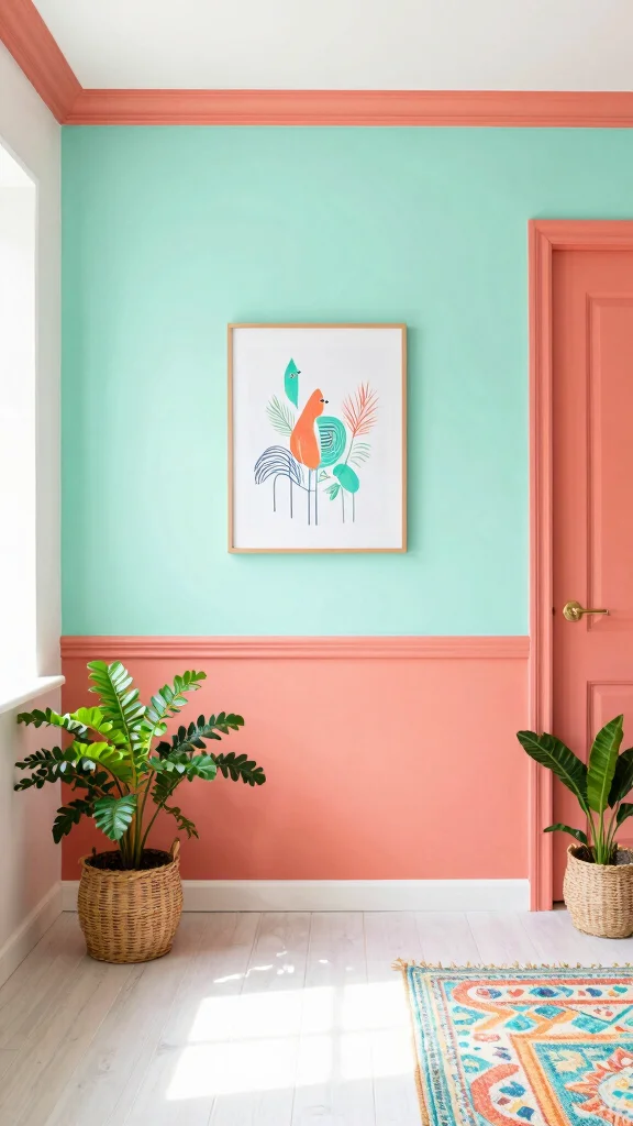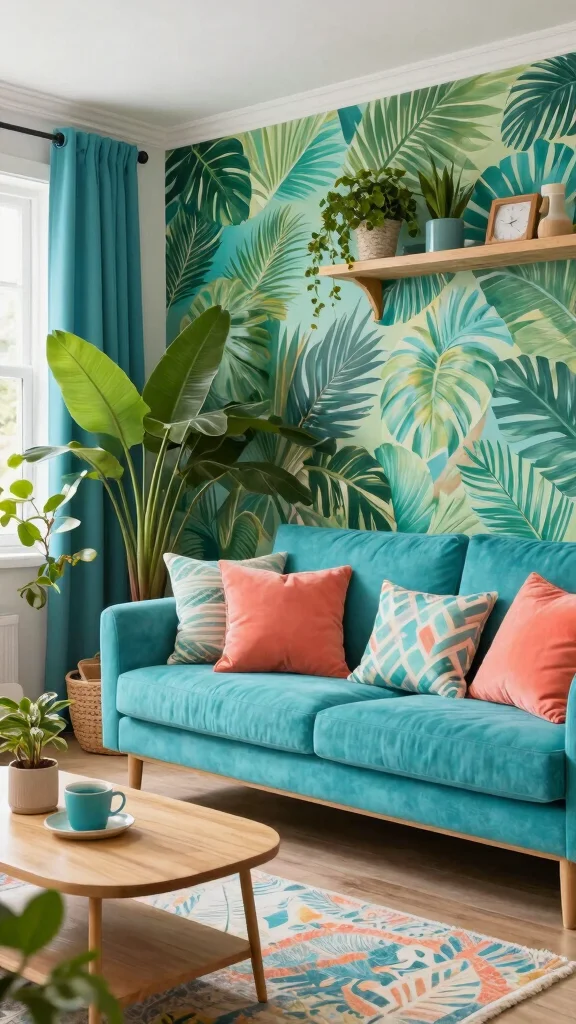 A vibrant tropical palette injects energy and sunshine. Turquoise, coral, and sunny yellow brighten any room and feel like a vacation. Pair bold walls with lighter neutrals and natural wood for balance. Add palm leaf prints and lush plants to complete the vibe.