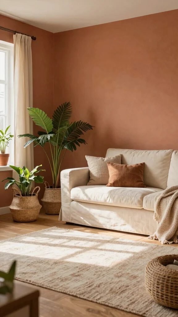 Warm terracotta and cream create a cozy, inviting mood. The earthy mix feels grounded and welcoming for daily life. Try terracotta walls paired with cream upholstery, plus terracotta pots with bright greenery for texture. Textiles like woven rugs and soft throws deepen the warmth.
