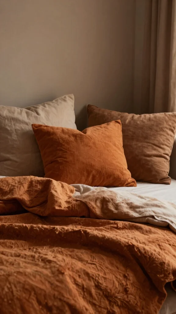 Muted autumn colors feel cozy and calm. Burnt orange, deep reds, and soft browns warm spaces. Use an accent wall in burnt orange with neutral furniture. Layer textures with throws and pillows for depth.