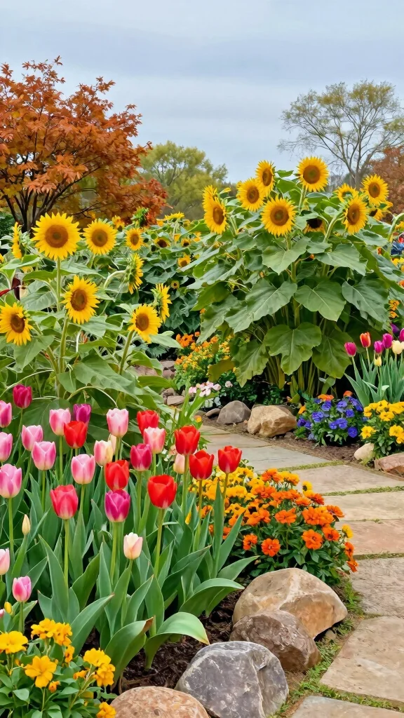 Seasonal color keeps the garden lively all year. Plan for blooms across the seasons to avoid dull months. Mix early spring bulbs with summer flowers and fall foliage. Choose plants with staggered bloom times for steady color. Pinterest and garden blogs love rotating color as seasons change.