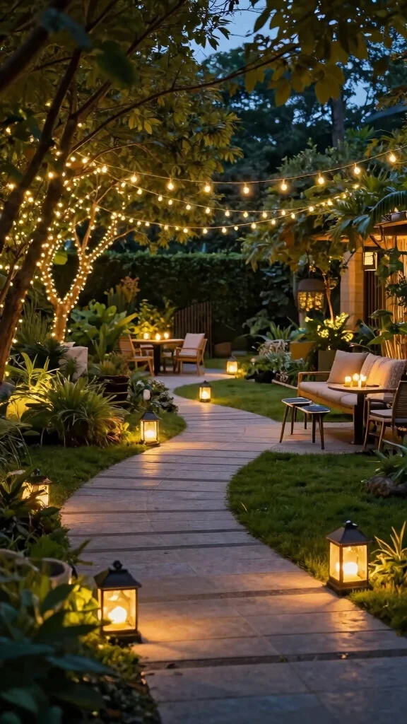 Outdoor lighting softens nights and extends use of your yard. String lights above seating create a warm canopy. Path lights guide guests with safety and charm. Lanterns near focal trees add glow. Spotlights highlight sculpture or features for drama. This lighting style brings evening magic to any garden.